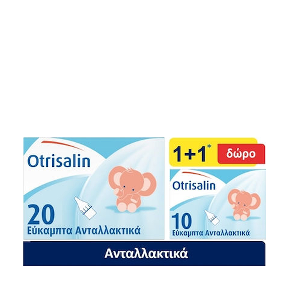 Η συσκευασία ανταλλακτικών Otrisalin περιέχει 20+10 δώρο εύκαμπτα ανταλλακτικά ακροφύσια μιας χρήσης με απορροφητικό φίλτρο που χρησιμοποιούνται με τη Συσκευή Ρινικής Απόφραξης Otrisalin (η συσκευή ρινικής απόφραξης πωλείται ξεχωριστά)